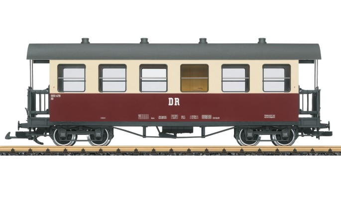 Modell eines Personenwagens mit Gepäckabteil der Deutschen Reichsbahn aus dem Netz der Harzer Schmalspurbahn. Originalgetreue Farbgebung und Beschriftung der DR Epoche IV. Viele angesetzte Details, Inneneinrichtung mit Toilette. Metallradsätze. Länge über Puffer 50 cm.